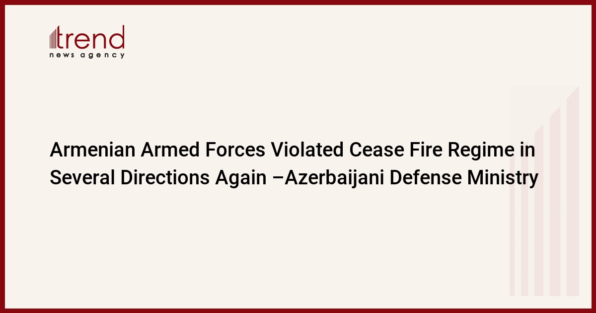 Azerbaijan, Baku, 25 March / Trend News corr E.Huseynli/ On 24 March, the Armenian Armed Forces have violated the ceasefire agreement by firing at the Azerbaijani National Army's positions from the positions in the Noyembaransk region to Kamarli village of Kazakh region of Azerbaijan from 6.50pm to 7.00pm on 24 March; from somewhere near the Fizuli region and Garakhanbayli village from 4:20p.m to 6:15a.m, from the nearby of Gizil Oba village from 7:20p.m to 7:35p.m, Javahirli village of Agdam region from 3:00a.m to 3:10a.m, the Azerbaijani Defence Ministry reported.