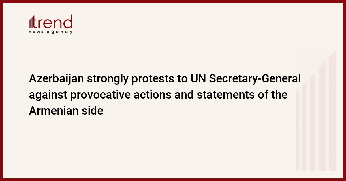 "Azerbaijan strongly protests against provocative actions and statements of the Armenian side, finds the aggressor's insolent behaviour as obvious manifestation of impunity for its crimes and considers the defiant rhetoric of the Armenian leadership as having the sole purpose of discrediting the ongoing conflict settlement process, misleading the international community and drawing its own public's attention away from the country's aggravating internal problems" said in letter addressed to the Secretary-General of UN by Tofig Musayev- a.i. of the Permanent Mission of Azerbaijan in United Nation.