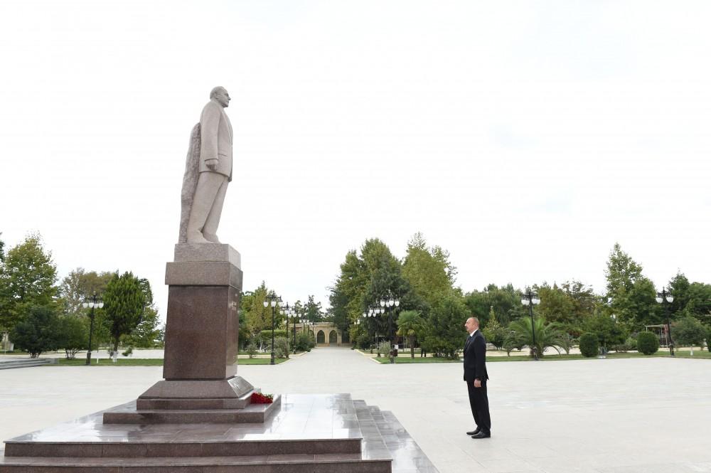 The head of state laid flowers at a statue of national leader Heydar Aliyev in the center of the city of Masalli.