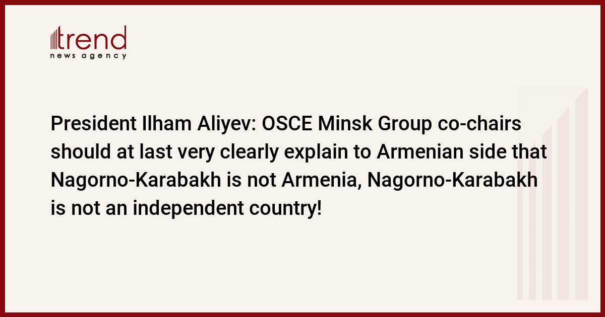 The OSCE Minsk Group co-chairs should at last very clearly explain to Armenian side that Nagorno-Karabakh is not Armenia, Nagorno-Karabakh is not an independent country, Azerbaijani President Ilham Aliyev said at the panel discussions on the Armenia-Azerbaijan Nagorno-Karabakh conflict held as part of the Munich Security Conference, Trend reports.