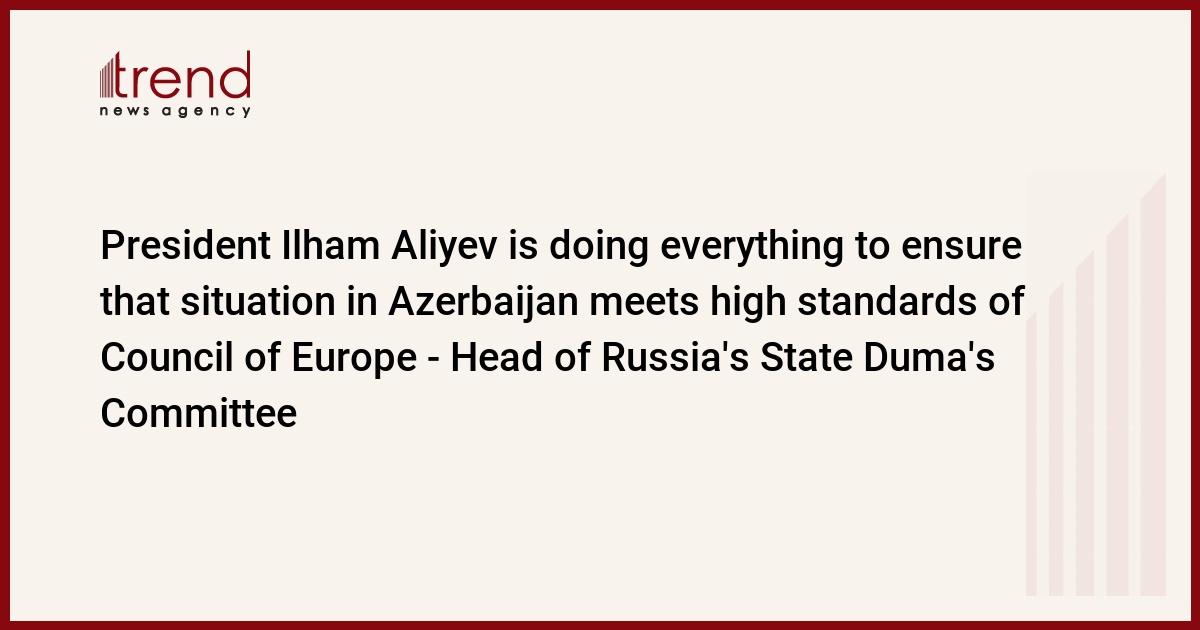 Azerbaijani President Ilham Aliyev is doing everything to ensure that the situation in the country meets the high standards of the Council of Europe, Chairman of the Committee of the State Duma of the Federal Assembly of the Russian Federation on International Affairs Leonid Slutsky said during his speech at the session of the Parliamentary Assembly of the Council of Europe (PACE), Trend reports.