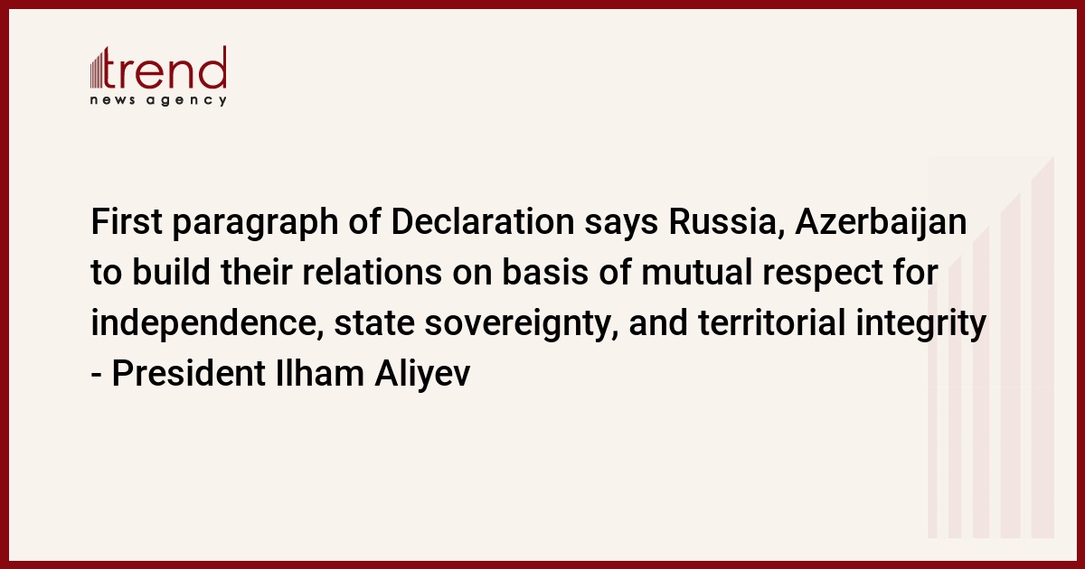 The first paragraph of the Declaration says that the parties will build their relations on the basis of mutual respect for independence, state sovereignty, territorial integrity, inviolability of borders and non-interference in each other's internal affairs, President of the Republic of Azerbaijan Ilham Aliyev said making a press statement together with Russian Federation Vladimir Putin, Trend reports.