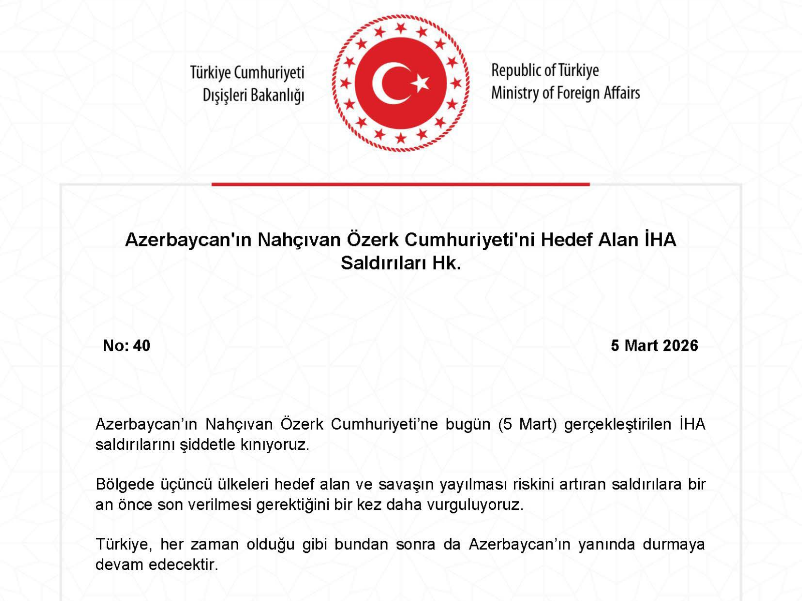 BAKU, Azerbaijan, March 5. The Turkish Foreign Ministry strongly condemns Iran's UAV attacks on Azerbaijan, the statement of the ministry says, Trend reports.