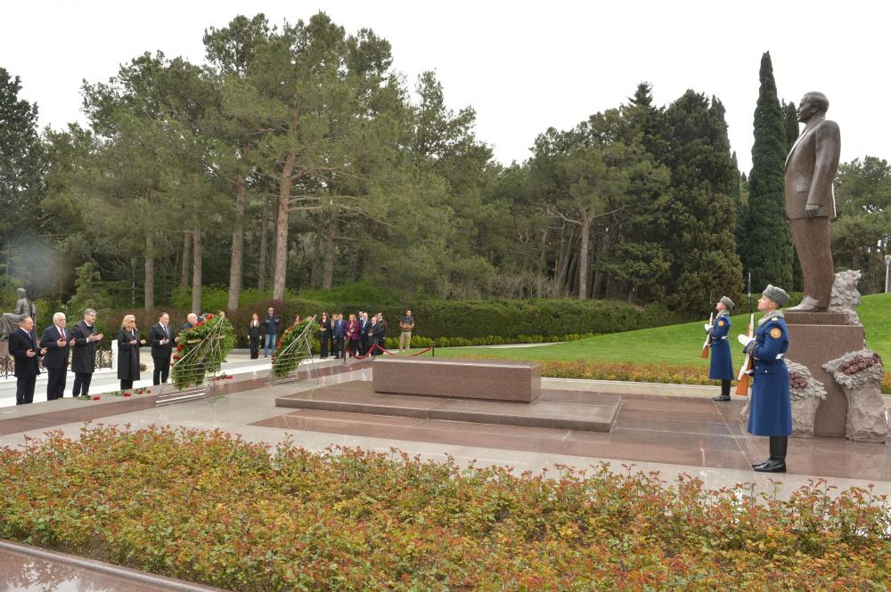 At the Alley of Honors, the delegations deeply respected the memory of Heydar Aliyev, the National Leader of the Azerbaijani people, the architect and founder of the modern independent Azerbaijani state, by laying a wreath at his grave and arranging fresh flowers.