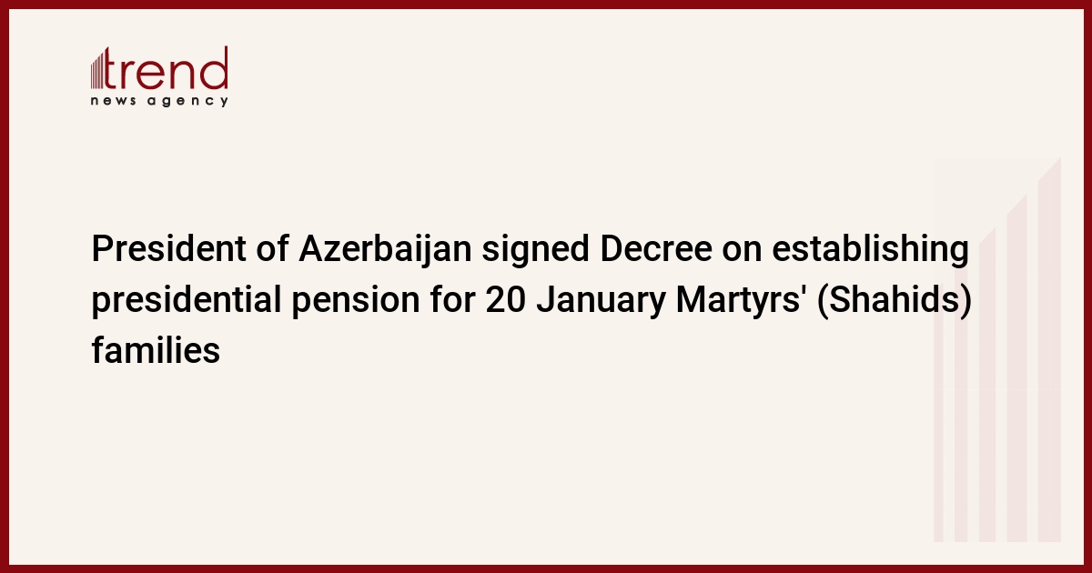 The Azerbaijan president Ilham Aliyev signed a Decree on 19 January 2006 for establishing the presidential pension for the Martyrs (Shahids) families who died on 20 January 2006, Trend reports.