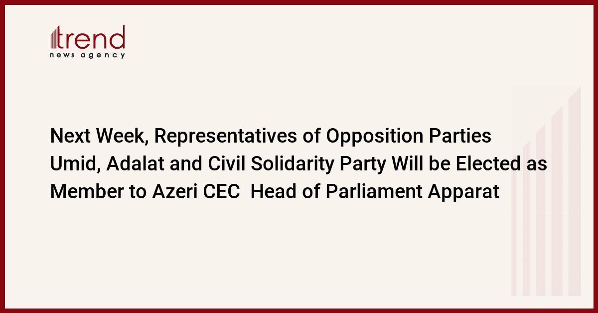 Next week, the representatives of the opposition parties Umid, Adalat and Civil Solidarity Party will be elected as members to the Central Election Commission of Azerbaijan (CEC), the head of the Apparat of Milli Majlis [Azerbaijani Parliament], Safa Mirzayev, briefed the media, Trend reports.