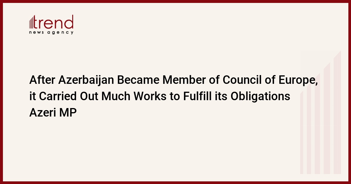 The member of the Azerbaijan delegation to the Parliamentary Assembly of the Council of Europe, MP Aydin Mirzazade, informed Trend that after Azerbaijan became the member of the Council of Europe, it carried out much work to fulfill its obligations undertaken before the Council of Europe. He said that presently Azerbaijan joined more than 200 international conventions and charters, including European Social Charter and European Charter on Human Rights.