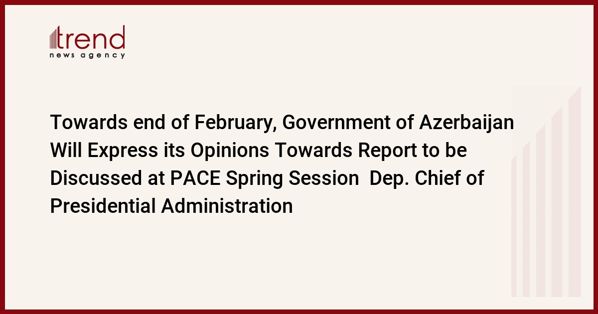 The Head of the Social-Political Department of the Executive Apparat of the Azerbaijani President, Ali Hasanov, exclusively informed Trend that towards the end of February, the Government of Azerbaijan will express its opinions towards the report that will be discussed at the spring session of the Parliamentary Assembly of the Council of Europe (PACE).