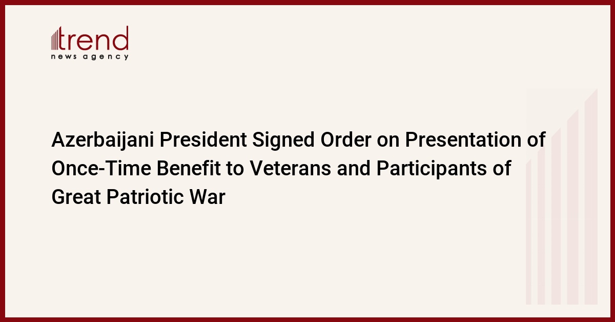 Azerbaijan, Baku/ Trend , corr. P. Amirdjanov /Today, on May 4, Azerbaijan's President, Ilham Aliyev, has issued Order on Presentation of Single Benefit to veterans and participants of the Great Patriotic War, as well as their widows, and those who were awarded with order and medals for bravery at the rear of the evil during the Great Patriotic War of 1941-1945, Trend reports referring to the National AzTV.