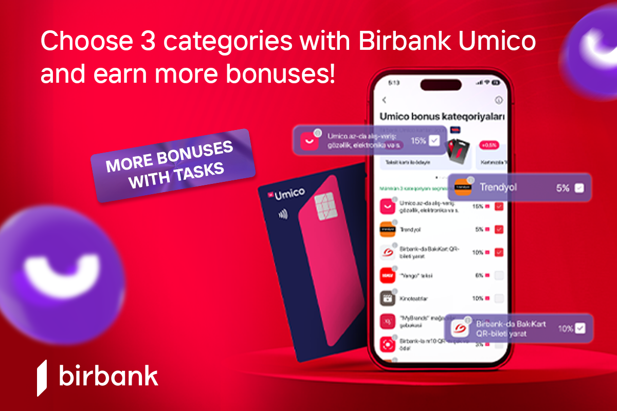 By selecting any three categories of their choice in the Umico section of the Birbank app, cardholders can earn bonuses on their payments. Plus, by completing in-app tasks, they have the opportunity to earn even more bonuses. In November, users can complete tasks like "₼50 payment on Umico.az," "Make three payments of any amount with QR" "₼15 payment at Bravo," and others.