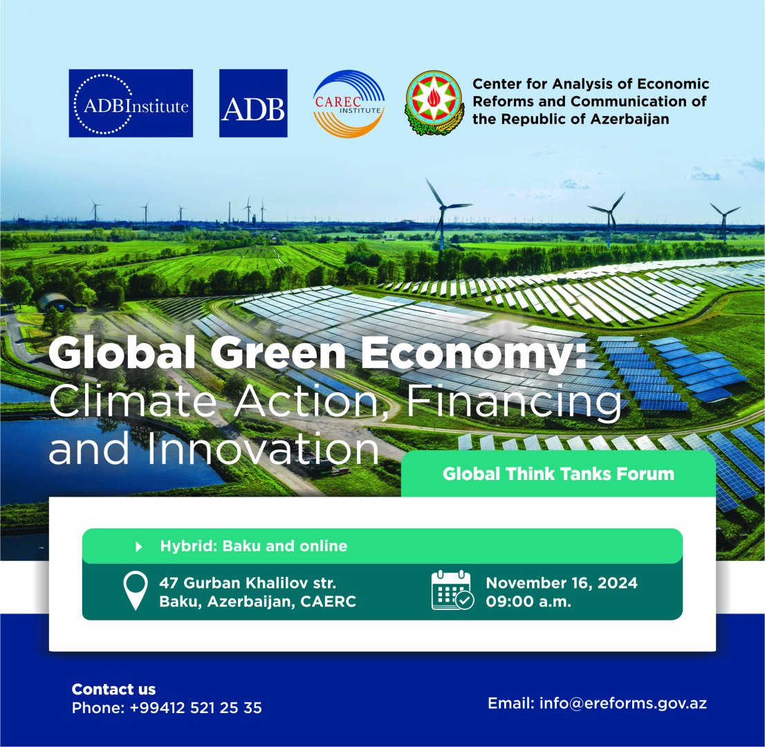 BAKU, Azerbaijan, November 4. The Center for Analysis of Economic Reforms and Communication of Azerbaijan (CAERC) will hold a forum titled "Global Think Tanks" in collaboration with the Asian Development Bank (ADB), the Asian Development Bank Institute (ADBI), and the Central Asia Regional Economic Cooperation Institute (CAREC Institute) on November 16, 2024, Trend reports via statement from CAERC.