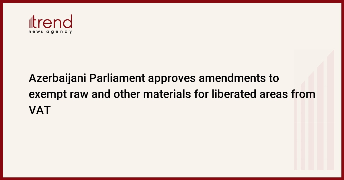 BAKU, Azerbaijan, December 9. The issue of exempting raw and other materials that are used in the liberated territories of Azerbaijan imported by residents from VAT (value added tax) was discussed at a meeting of the Azerbaijani Parliament on December 9, Trend reports.
