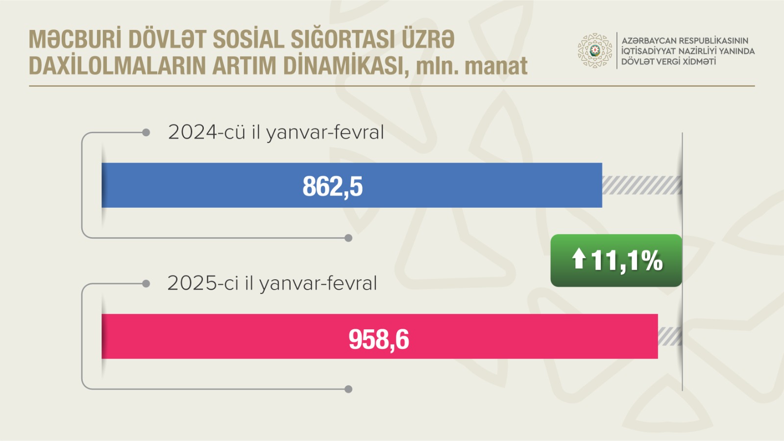 BAKU, Azerbaijan, March 12. The revenues on compulsory state social insurance contributions in Azerbaijan under conditions of the "formalization" of the number of employees and the wage fund exceeded 958.6 million manat ($563.88 million) from January through February 2025.