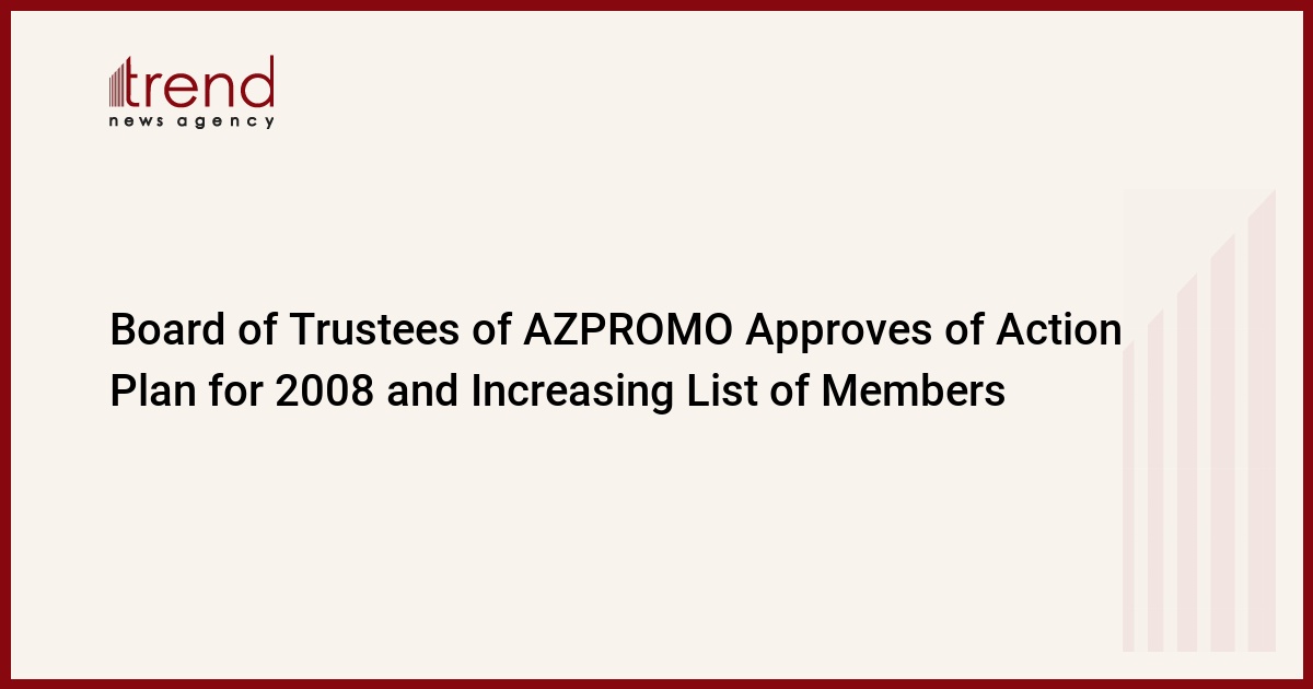 Azerbaijan, Baku, 5 March / corr. Trend I. Khalilova/ The Board of Trustees of the Export and Investment Promotion Fund of Azerbaijan (AZPROMO) approved of the action plan for 2008 in its first meeting of 2008. An Information Business Center on the basis of the Export Center and Joint Venture Program is expected to be established in the course of 2008, AZPROMO said.