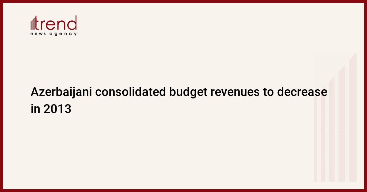 The Azerbaijani consolidated budget's revenues in 2013 will amount to 20.724 billion manat, or 1.123 billion manat (5.1 percent) less compared to 2012 and the actual figures as of 2011 - by 2.502 billion manat or 10.8 percent, the information stated in the Azerbaijani draft state and consolidated budgets for 2013 and the next three years, published by the Finance Ministry, said on Monday.