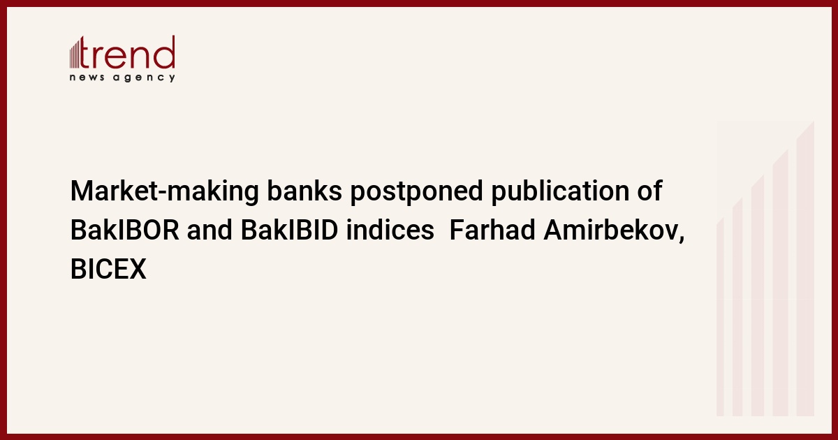 Meeting of banks with market-maker status is to be held by the end of April. Trend reports with reference to Farhad Amirbekov, head of Baku Interbank Currency Exchange (BICEX), that the meeting agenda includes loans on interbank crediting, as well as the stock exchanges right to publish banks loan rates - BakIBOR and BakIBID indices, which today are the main indices of Azerbaijans money market.