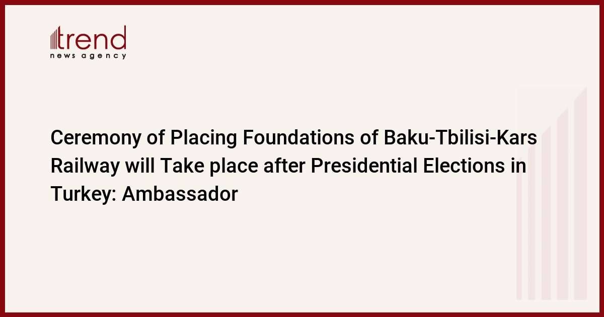 Azerbaijan, Baku / corr. Trend S.Ilhamgizi / The Ambassador of Turkey to Azerbaijan, Huseyn Avny Garslioglu, said on 29 May that a ceremony for placing the foundations of the Baku-Tbilisi-Kars railway will take place after the presidential elections in Turkey. According to the Ambassador, a meeting of specialists from Azerbaijan and Turkey on the railway will take place in Turkey in the near future. Earlier such a meeting took place in Baku. "Presently technical issues are being discussed and after completion of negotiations, a ceremony for placing the foundations of the railway will take place," the Ambassador said, adding that discussions on the Baku-Tbilisi-Kars railway will took place during his visit to Nakchivan Autonomous Republic of Azerbaijan.