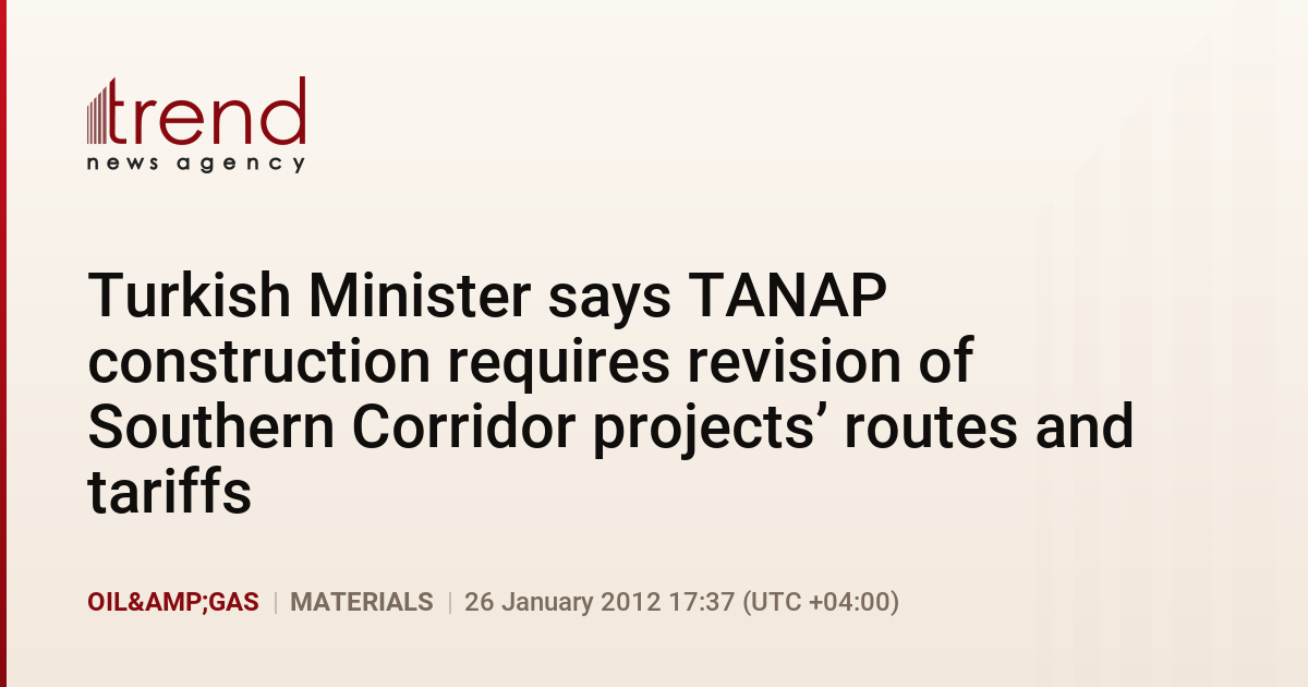 The construction of Azerbaijani-Turkish Trans-Anatolian Pipeline (TANAP) will require revision of Southern Gas Corridor projects' (Nabucco, TAP and ITGI) routes and tariffs, Turkish Energy Minister Taner Yildiz said in an interview to Reuters.