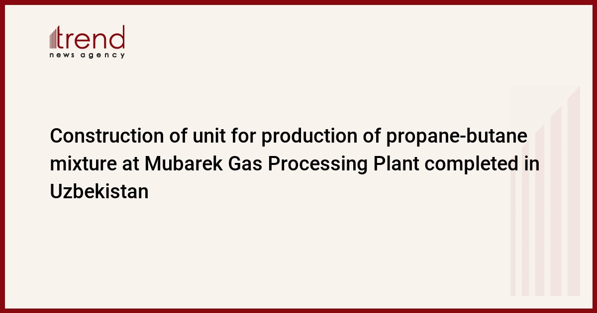 Construction of the unit for production of propane-butane mixture with design processing capacity of 12 billion cubic meters of natural gas per year at Mubarek Gas Processing Plant in Uzbekistan is completed, representative of the Ukrainian enterprise Sumy Frunze NPO, Leonid Naumov said during the Oil & Gas Uzbekistan 2013 international exhibition held in Tashkent.