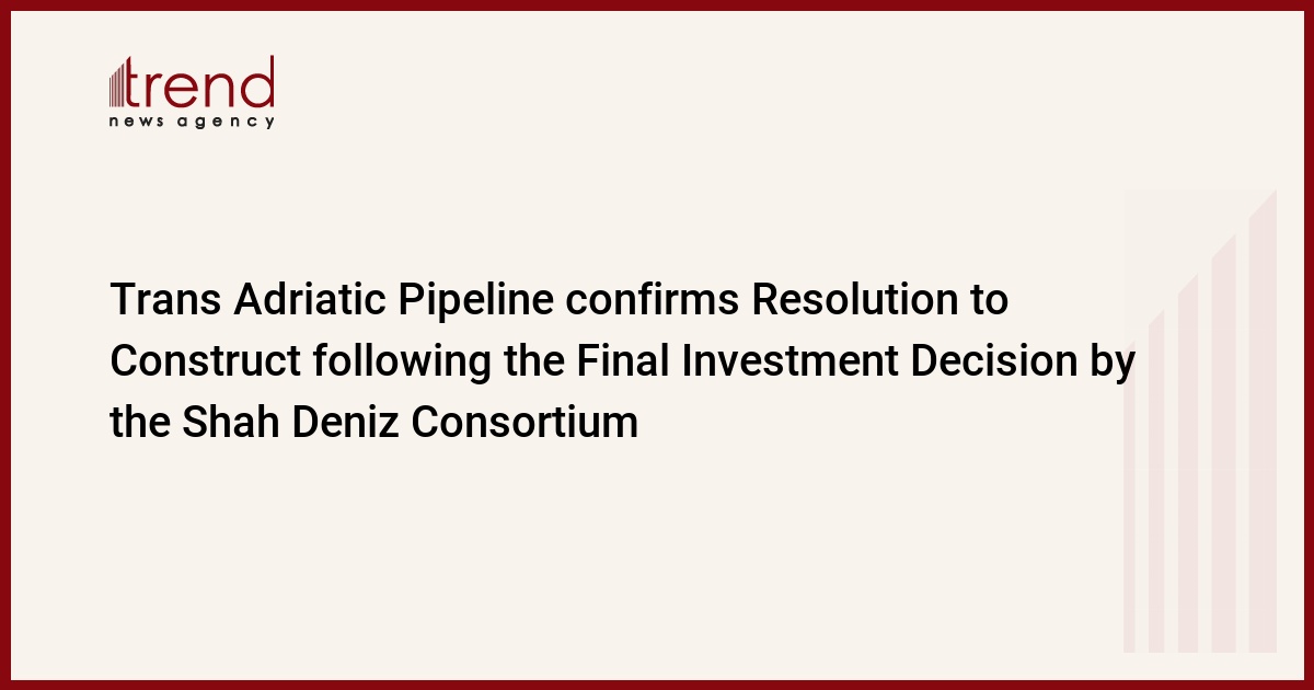 The Trans Adriatic Pipeline's shareholders (SOCAR, Statoil, BP, Fluxys, Total, E.ON and Axpo) confirmed today that they have passed the Resolution to Construct on the development and construction of the Trans Adriatic Pipeline project. This follows the announcement earlier today by the Shah Deniz Consortium that it has taken the Final Investment Decision on the Shah Deniz Stage II project.