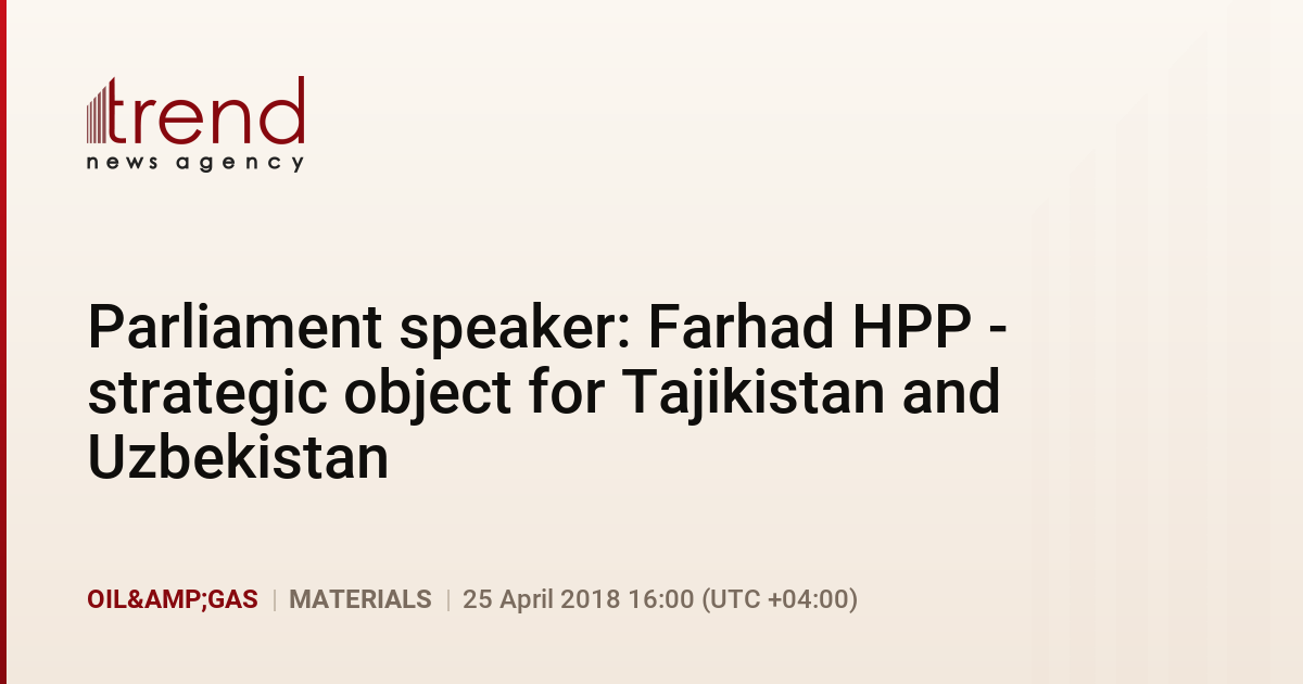 Solving the issue of the Farhad hydropower plant between Tajikistan and Uzbekistan is an important strategic step, Tajik media reported on April 25, citing Speaker of the lower chamber of the Tajik parliament Shukurjon Zuhurov.