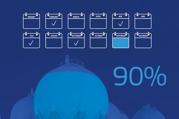 According to the EU Gas Storage Regulation (EU/2022/1032), countries are required to fill their gas storage facilities to at least 90% capacity by November 1, 2025.
