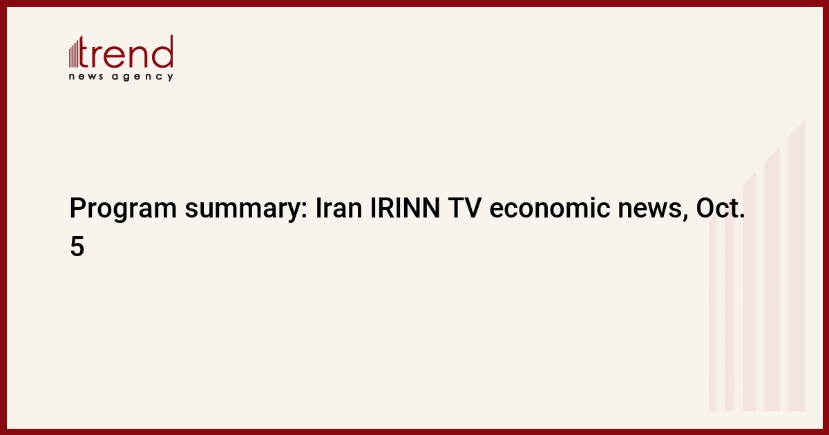 The following is a numbered list of news on latest economic developments in the Islamic Republic of Iran, as of 12:00 GMT, Oct. 5, on IRINN TV.