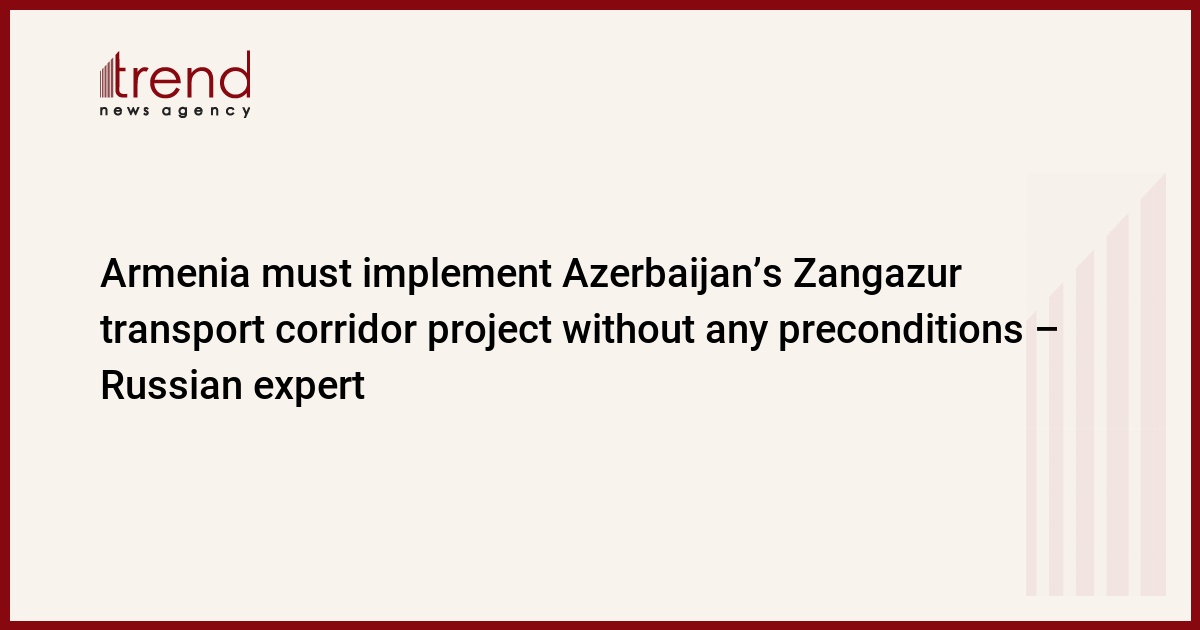 The project of Azerbaijan’s Zangazur transport corridor, within which there must be a railway and road between the Nakhchivan Autonomous Republic and Azerbaijan, must be implemented by Armenia without any preconditions, Russian military expert, editor-in-chief of the National Defense magazine Igor Korotchenko told Trend on Dec. 15.
