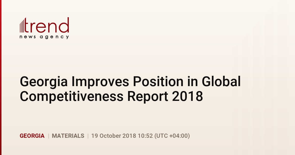 Georgia has advanced its position by one point and is ranked 66th among the world’s 140 economies assessed in the Global Competitiveness Report 2018, an annual report published by the World Economic Forum, GeorgiaToday reports.