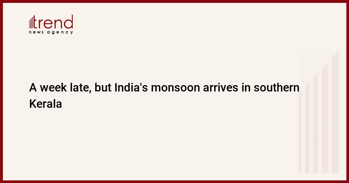India’s annual monsoon, which delivers about 70 percent of the country’s rainfall, officially arrived on the coast of southern Kerala state on Saturday, the weather office said, a week later than usual, reports Trend citing to Reuters