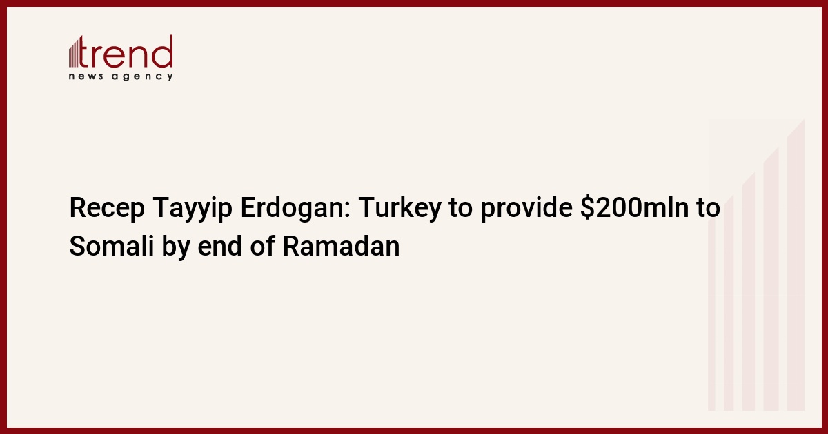 Turkey will provide $200 million to Somalia by the end of Ramadan month, Turkish Prime Minister Recep Tayyip Erdogan said on Wednesday in Istanbul.